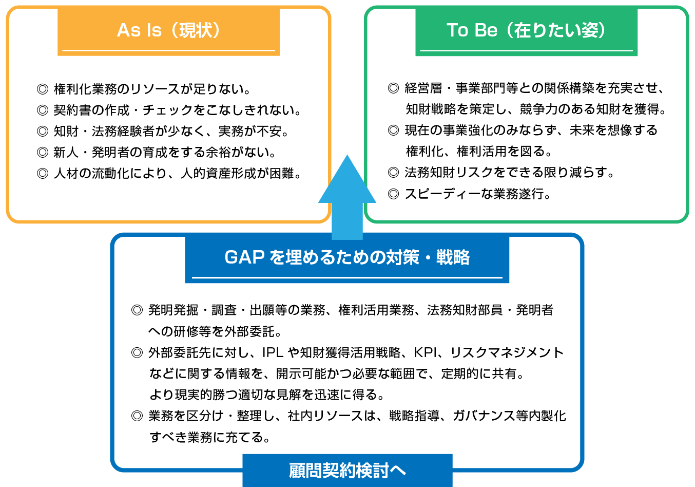 弊所は、従来からある法律事務所としての顧問契約業務である企業法務全般にまつわる法律相談、契約書チェック業務だけでなく、知財関連業務を中心としたご要望にも対応しております。